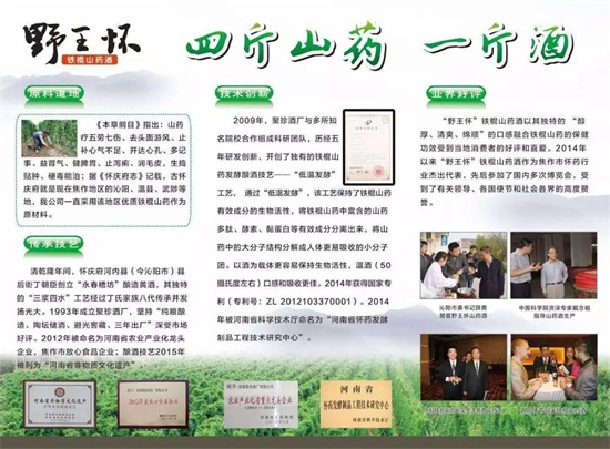 通過多方溝通尋訪,于2009年開始與多家大專院校合作共同研發(fā)鐵棍山藥酒,研發(fā)過程也是歷經(jīng)了不少的艱辛坎坷,歷時5年,終于成功。于2014年獲得了國家專利,并于2014年成立了野王懷氏生物科技有限公司,鐵棍山藥酒通過低溫發(fā)酵釀造成酒,不僅能將山藥中的營養(yǎng)成份悉數(shù)保留,藥借酒力,酒攜藥功,更是使人體吸收率大幅提高,賦予了懷鐵棍山藥更高的價值。同時,與當(dāng)?shù)厣剿幏N植戶和合作社簽訂常年收購合同,穩(wěn)定了山藥的市場價格,也帶領(lǐng)著大家一起致富奔小康。