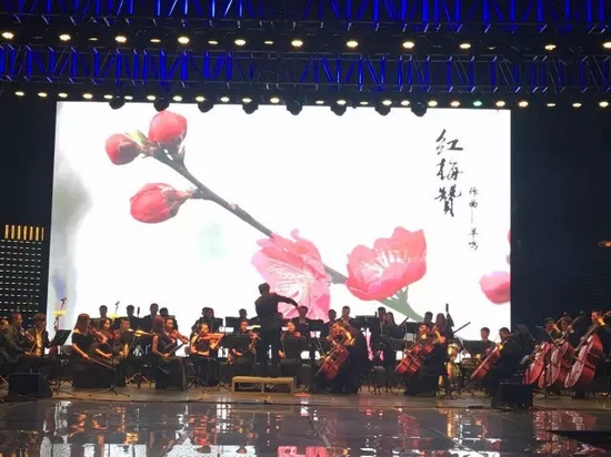 伴隨臺上指揮黃俊博的手勢起,河南愛樂樂團開始演奏交響樂《紅旗頌》。
