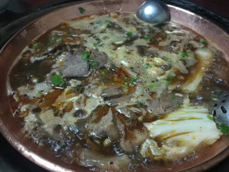 銅瓢牛肉也是不可錯(cuò)過的美味,超大的銅瓢盛著滿鍋的帶皮牛肉和牛雜,蘸小米椒腐乳調(diào)料吃超過癮。最受食客歡迎的還要數(shù)瓢里煮得香香辣辣糯糯軟軟的牛舌牛筋牛皮,直可以把人吃得眼皮出汗。