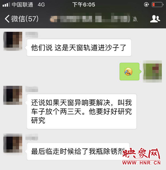 網(wǎng)友的交流內(nèi)容顯示,他們曾先后到各地的4s店進行過維修,除了少部分4s店表示,需要把車子留在店里檢查三四天時間,其他大部分4s店對于此類問題的解釋均為天窗出現(xiàn)異物所致,而解決辦法也大致相同——對天窗軌道進行清理和潤滑。
