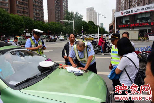在路口的西南角,停著一輛出租車。鄭州市交警四大隊(duì)兩名民警正向雙方當(dāng)事人詢問情況。