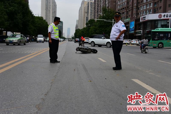 9月5日中午,鄭州市福元路上,一名初中男生騎電動(dòng)車送女同學(xué)回家。當(dāng)其由西向東行駛至福元路與鳳臺(tái)路交叉口時(shí),疑與一輛在路口左拐的出租車發(fā)生碰撞。電動(dòng)車失控倒下,女生從后座重重倒地,頭部、臉部受傷,全身抽搐,昏迷不醒。