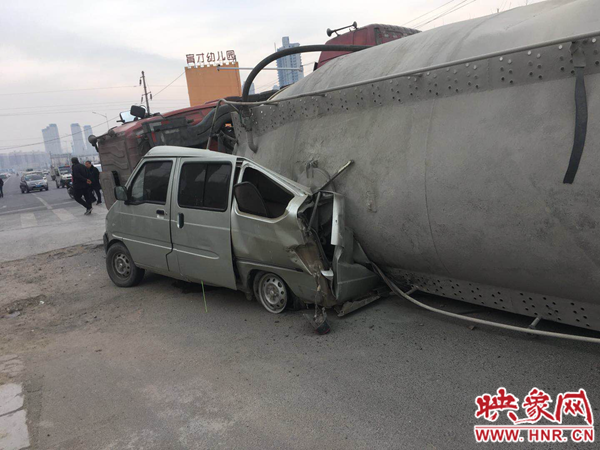 22日上午9時(shí)30分左右,江山路與新苑路交叉口東北角,車牌號(hào)為豫EX115掛的槽罐車仍然壓在車牌號(hào)豫AA817Y的面包車上。槽罐車上裝有40多噸散裝水泥,另一輛趕來救援的槽罐車正在將事故車內(nèi)的水泥轉(zhuǎn)移出來。救援的槽罐車司機(jī)說,事故發(fā)生時(shí),槽罐車沿江山路由南向北行駛,走到與新苑路交叉口時(shí),面包車沿江山路由北向東左拐。事故路口沒有紅綠燈,大車司機(jī)看到面包車后,立即向右打方向,躲避面包車。由于離心力作用,大車向左側(cè)翻,壓在面包車上,將面包車四分之三壓扁,僅剩駕駛室位置。