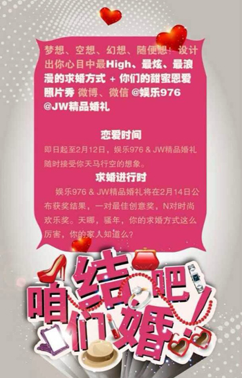 2月12日娛樂(lè)976全新上線,我們?yōu)槟蛟煲粓?chǎng)廣播史上最時(shí)尚最浪漫的求婚派對(duì)+結(jié)婚盛典!只要心中有愛(ài),求婚方式可以多姿多彩,怎樣的求婚才能讓她難忘、心甘情愿說(shuō)“I do!”?現(xiàn)在,只要有創(chuàng)意的求婚方式,就可以獲得10萬(wàn)元求婚+結(jié)婚盛典!求婚,你準(zhǔn)備好了嗎?咱們結(jié)婚吧!