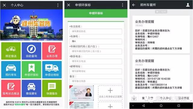 不出家門,也可以領(lǐng)到綠標(biāo)自2015年7月27日起,鄭州車管所聯(lián)合鄭州環(huán)保局在微信公眾平臺(tái)推出了“微信申領(lǐng)環(huán)保標(biāo)”的服務(wù),如果您是“6年免檢”車輛的車主,即可通過微信平臺(tái)在線申領(lǐng)綠色環(huán)保標(biāo),申領(lǐng)成功后,會(huì)有專門的快遞人員送標(biāo)到家。