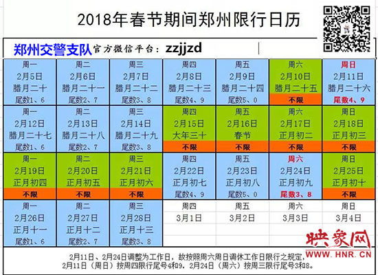 映象網(wǎng)訊(記者 秦雯)2018年春節(jié)長(zhǎng)假?gòu)?月15日開始至2月21日結(jié)束,共7天,春節(jié)將至,為了確保在市民人流、車流、物流最密集的時(shí)段可以安全出行。2月5日,記者從鄭州市交警支隊(duì)了解到:2月15日至2月21日春節(jié)七天長(zhǎng)假期間,鄭州市區(qū)三環(huán)以內(nèi)所有機(jī)動(dòng)車尾號(hào)不限行,但2月11日(星期日)、2月24日(星期六)上班,因法定節(jié)假日放假調(diào)休而調(diào)整為上班的周六、周日,按對(duì)應(yīng)調(diào)休的工作日限行,因此2月11日(周日)按周四限行規(guī)定,限行尾號(hào)4和9;2月24日(周六)按周三限行規(guī)定,限行尾號(hào)3和8。