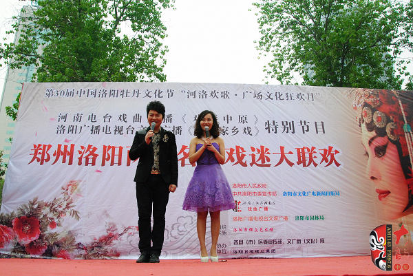 4月17日上午,在位于洛陽(yáng)市中心、以體現(xiàn)周朝文化為主題的周王城廣場(chǎng),“周公營(yíng)建洛邑”雕塑旁,主辦方舉辦了一場(chǎng)別開生面的戲曲演唱會(huì)。來(lái)自鄭州、洛陽(yáng)兩地的豫劇名家張?jiān)聵s、曾廣蘭、趙曉梅、王藝紅,著名演員徐俊霞、陳大華、劉亞林、曲韻、劉海功、沈萍,梨園春明星擂主張艷紅、謝憲笙等為來(lái)自全省各地的戲曲廣播《戲迷俱樂(lè)部》百余位戲迷和現(xiàn)場(chǎng)的廣大觀眾奉獻(xiàn)了精彩的戲曲唱段。藝術(shù)家們演唱的《洛陽(yáng)橋》、《秦雪梅》、《七品芝麻官》、《對(duì)花槍》、《拷紅》、《收姜維》、《朝陽(yáng)溝》、《倒霉大叔的婚事》、《小白鞋說(shuō)媒》、《紅菊》等不同劇種、不同流派、不同行當(dāng)?shù)哪捴巳丝诘某唬┑糜^眾一陣又一陣的掌聲,河南戲曲廣播主持人媛媛、李鋮表演的雙簧妙趣橫生,引得觀眾樂(lè)不可支。