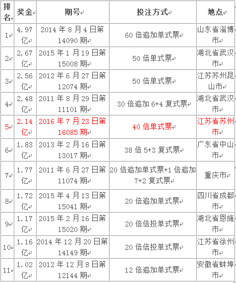 數(shù)據(jù)顯示,江蘇省41注頭獎(jiǎng)(含1注追加)出自蘇州市第3205005209101體彩投注站,其中一張中獎(jiǎng)彩票中得40注頭獎(jiǎng),該中獎(jiǎng)票為一張單式票,進(jìn)行了40倍投注,投注共計(jì)80元,該票累計(jì)中獎(jiǎng)2.14億元。為今年體彩大樂(lè)透開(kāi)出的第1個(gè)億元大獎(jiǎng)。