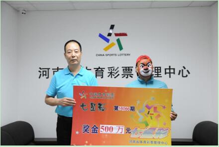 ?。ê幽鲜◇w彩中心孫和平主任為開封七星彩500萬中獎彩民頒獎)
