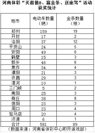 [摘要] 9月份開(kāi)展“買超值8、贏金條、送座駕”即開(kāi)型體育彩票促銷活動(dòng)早已圓滿收官,18地市彩民瓜分581輛“座駕”和89根金條!從獲獎(jiǎng)情況看,鄭州、安陽(yáng)、新鄉(xiāng)的彩民中得“座駕”數(shù)量位居前三甲,從獲得金條數(shù)量看,鄭州、洛陽(yáng)、商丘彩民的獎(jiǎng)品含金量則居前。