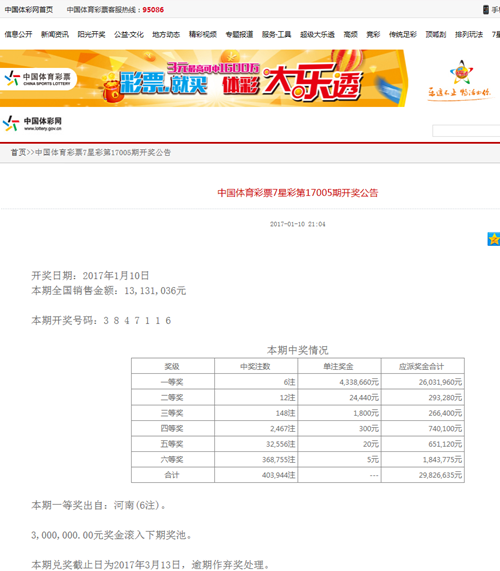 1月10日晚,七星彩第17005期開獎,開獎號碼為3847116。當期全國中出一等獎6注,單注獎金433.86萬元,全部被河南彩民斬獲,總獎金2600余萬元,一次性掏空了全國獎池。