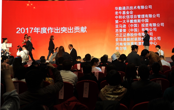 河南省體育彩票管理中心榮獲中國扶貧基金會(huì)“2017年度扶貧突出貢獻(xiàn)獎(jiǎng)”,中心黨支部書記王海新代表單位領(lǐng)取了獎(jiǎng)杯和證書。