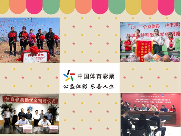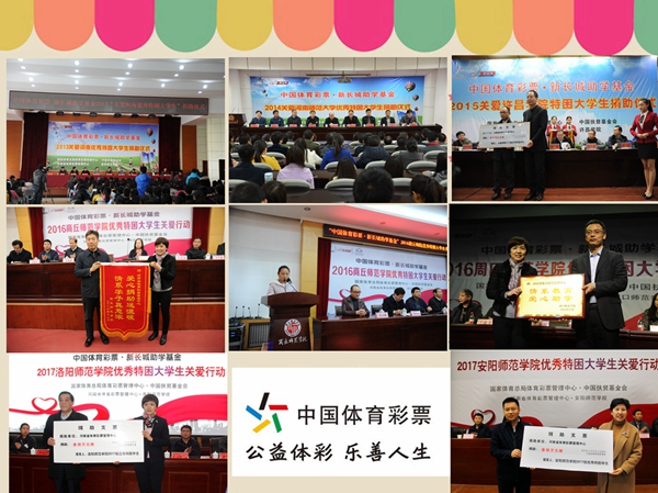 河南省體育彩票管理中心自2013年開始,已經(jīng)連續(xù)五年通過國家體育總局體育彩票管理中心與中國扶貧基金會(huì)合作,以“中國體育彩票·新長城助學(xué)基金”形式,向信陽師范學(xué)院、河南師范大學(xué)、許昌學(xué)院、商丘師范學(xué)院、周口師范學(xué)院、洛陽師范學(xué)院、安陽師范學(xué)院共計(jì)7所院校的400名優(yōu)秀貧困大學(xué)生累計(jì)捐助助學(xué)金200萬元。2015年,河南體彩中心在前兩年每年捐助50名貧困大學(xué)生的基礎(chǔ)上,將受助名額增加到了60名,2016年開始又將捐贈(zèng)學(xué)校從一所增加到兩所,受助學(xué)生名額從60名又增加到120名,每個(gè)學(xué)生的受助金額從4000元提高到了5000元,希望幫助更多的困難學(xué)生及其家庭減輕經(jīng)濟(jì)負(fù)擔(dān)和精神壓力。