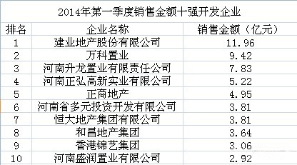 由克而瑞(CRIC)統(tǒng)計的《2014年一季度鄭州市商品住宅銷售金額十強開發(fā)企業(yè)》、《2014年一季度鄭州市商品住宅銷售面積十強開發(fā)企業(yè)》出爐。建業(yè)地產(chǎn)股份有限公司以11.96億元的銷售金額奪得一季度銷售冠軍,銷售面積達(dá)9.58萬㎡。