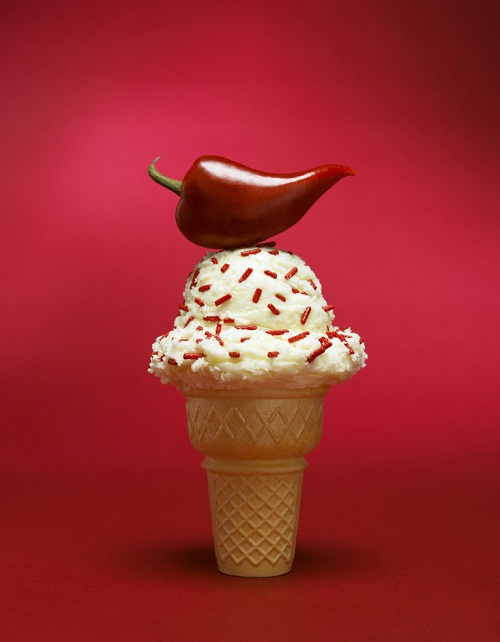 辣椒冰淇淋是墨西哥獨(dú)有的口味。點(diǎn)一杯冰淇淋,小販麻利地抄起一個辣椒杯,迅速往里舀了三大勺冰淇淋球,口味很多種:巧克力、香草、檸檬、草莓、咖啡等,上面還會加芒果、草莓、甜瓜等水果,不過這些都不是主角,涂滿杯壁的紅色辣椒醬,才是味覺的中心。這種紅色的辣椒醬,一般由辣椒面、鹽、醋和糖調(diào)制而成,滋味如同配料一樣,酸甜辣咸融為一體。裝好冰淇淋,小販還會在杯子里插一個辣椒棒棒糖,一來可以增加口味,二來還能當(dāng)勺用。小攤上還擺著自助調(diào)料臺,很多墨西哥人嫌滋味不夠,還會再加辣椒醬,撒辣椒鹽或是擠檸檬汁。