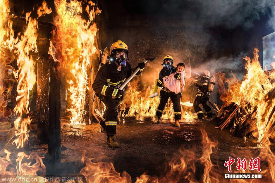 2014年11月6日,四川成都,“烈火中,他們展雄威,救人于危難,豪氣干云天”。當(dāng)晚10時(shí),11·9消防日即將到來,四川省消防總隊(duì)與成都商報(bào)聯(lián)合推出 “烈火雄心”系列海報(bào)式視覺大片,以情景再現(xiàn)的專業(yè)攝影手段,刻畫出消防官兵一個(gè)個(gè)真實(shí)的工作畫卷。整個(gè)系列海報(bào)由9幅照片組成,涵蓋了車禍救援、火場(chǎng)突圍、高樓救人等多個(gè)救援場(chǎng)景,海報(bào)中男消防員威武豪氣,女消防員英姿颯爽?!霸?19宣傳日,是想以一種更加直觀、形象的方式,還原消防員真實(shí)的生活工作狀態(tài)?!睋?jù)這組大片的主創(chuàng)人員介紹,這次的組圖拍攝,類型包括地震廢墟、車禍困人、高樓營(yíng)救等各類場(chǎng)景,將更全面的向世人展示不同類型的消防員,以及他們?cè)诰仍F(xiàn)場(chǎng)背后的感人瞬間,從各個(gè)層面展現(xiàn)出消防官兵他們奮不顧身、舍生忘死、一心為民的英雄本色。本組圖片中的角色,都是實(shí)實(shí)在在的消防員。每張海報(bào)的背后,都有著類似的救援故事,讓這些看似熟悉的場(chǎng)景,用海報(bào)大片的形式呈現(xiàn)給大家,將事實(shí)再現(xiàn)。圖片署名:成都商報(bào)-東方IC