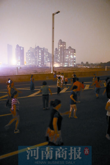 前天晚上7時(shí)30分,鄭州市南三環(huán)與京廣路交叉口向南500米路西,幾名市民沿著高架橋匝道向二層走去。高架橋二層橋面西側(cè),人們?nèi)宄扇?,大人們邊走邊聊天,小孩兒則在車道上嬉笑玩耍。東側(cè),一名女士大步快速地向北走,“不刮風(fēng)不下雨,沒(méi)事兒就來(lái)這鍛煉?!贝送?,還有30多名市民正在跳廣場(chǎng)舞。