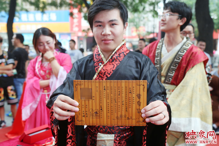 下午17點30分,鄭州二七廣場附近的一處小廣場前熱鬧非凡,8對年輕男女身著古裝,參加愛的“賣身契”簽約儀式。