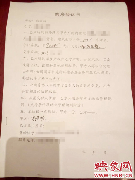 現(xiàn)場(chǎng)的居民向記者出示了當(dāng)時(shí)的一份購(gòu)房協(xié)議書(shū),房屋售賣(mài)甲方的一欄赫然寫(xiě)著“郭炎嶺”的名字。