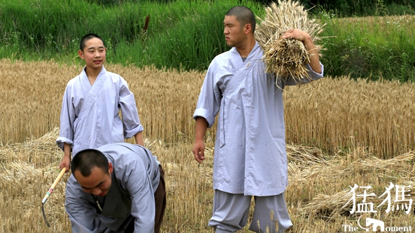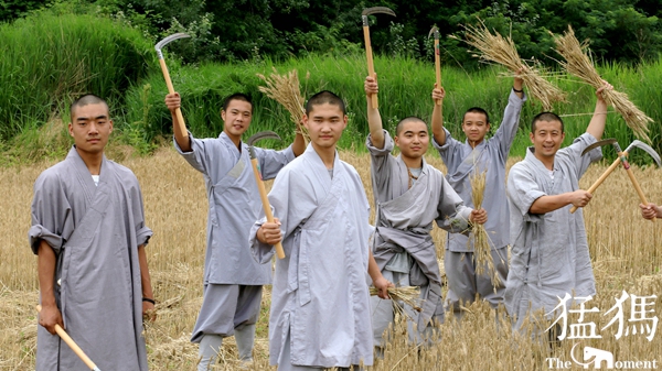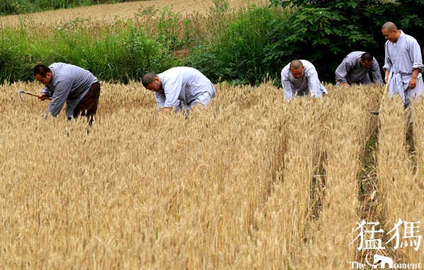 經(jīng)過(guò)一上午辛勤的勞作,少林寺僧眾們將收獲的麥子裝袋,在歡聲笑語(yǔ)中,肩抗著一袋袋麥子,搬送到運(yùn)載車上。金黃色的麥桿,點(diǎn)綴著僧人們的灰色布袍,好像與天地一體,融成一幅和諧的畫卷……