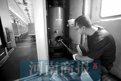 7月28日,新鄉(xiāng)最高氣溫36℃。下午1點30分,河南商報記者進入車廂,車廂內(nèi)溫度計顯示44℃。這個時候,供水員李波和王旭陽,已經(jīng)在車上工作了1個多小時。當(dāng)河南商報記者走近茶爐時,甚至能感覺到毛孔在一瞬間“炸開”。作為上車最早的茶爐工,他們中午12點就要上車,找劈柴、點火、燒水,將每個硬座車廂的保溫桶和全車66個暖瓶灌滿。2014年綠皮車相繼淘汰,自此再沒專人提供用于燃煤茶爐點火的劈柴,全靠供水工自己找尋。
