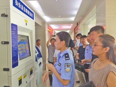 市民想了解自助領(lǐng)取身份證業(yè)務(wù),民警在自助取證機(jī)上演示。