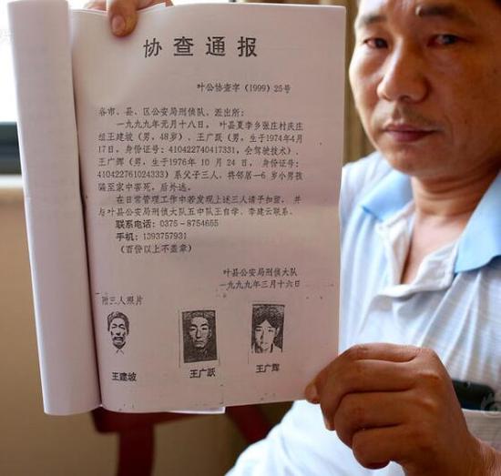 當(dāng)年被通緝的幾個人,被認(rèn)定嫌疑最大的王某躍至今未歸案。村民推斷,一個人較難完成殺人、埋尸、抬柜子掩藏。而且,葉縣警方信息顯示,王某躍患有精神疾病。不久后,公安局下發(fā)了協(xié)查通報稱,王某坡、王某躍、王某輝系父子三人,“將鄰居一6歲小男孩騙至家中害死,后外逃?!?/p>