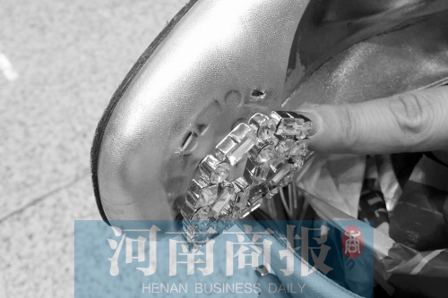 河南商報(bào)記者發(fā)現(xiàn),范女士這雙鞋的兩個(gè)鞋花,均出現(xiàn)與鞋體脫離的情況,其中左腳那只鞋,原本有四個(gè)連接鞋體和鞋花的卡子,可如今只剩下兩個(gè)。