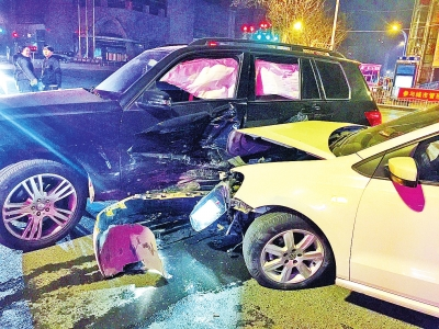 車禍發(fā)生時(shí),已是2月15日的凌晨4時(shí)許,在紫荊山路與東大街交叉口,發(fā)生碰撞的兩輛車為一輛大眾Polo轎車和一輛奔馳GLK越野車。大眾轎車攔腰撞上奔馳車,兩車均受損嚴(yán)重變形。