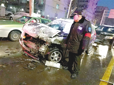 日暮雪大,路上結(jié)冰,一輛雪鐵龍由北向南行駛,撞上兩輛汽車與一輛公交車,雪鐵龍轎車司機滿身酒氣,被警方帶去醫(yī)院抽血取證。圍觀市民看到路口被堵,紛紛譴責(zé)這名涉嫌酒駕的司機:明知雪天路難走,還違法駕駛,真是不應(yīng)該。