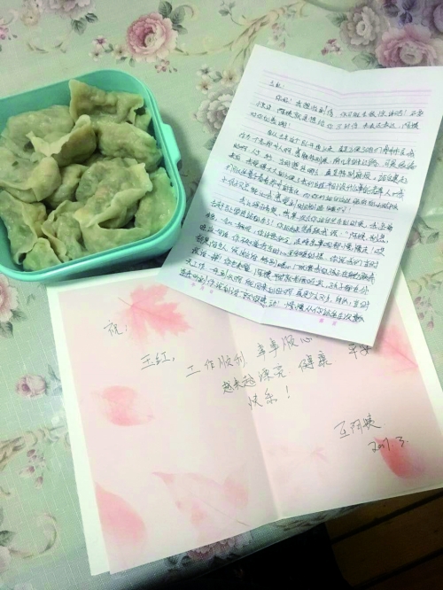 接過餃子的董玉紅感到很意外,緊接著,王大娘又從包里掏出了一封信和一張賀卡,一起遞到了董玉紅手中。打開信的一瞬間,董玉紅眼里的淚花打著轉(zhuǎn),“沒有想到,王大娘會(huì)親自給我寫了這么長(zhǎng)的一封信……”