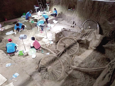7月12日,在新鄭市鄭國三號車馬坑發(fā)掘現(xiàn)場,經(jīng)過5個多月的發(fā)掘,考古人員已清理出了3輛車,發(fā)現(xiàn)有車輪、車轅、車輿等,其中,一輛為大型安車(古代高級官員或貴族坐乘的馬車),隨之出土的還有車上的青銅部件等裝飾品。