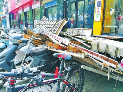 本報(bào)訊8月5日下午1時(shí)40分左右,鄭州市民李女士逛過(guò)大學(xué)路一家沿街服裝店,轉(zhuǎn)身剛剛離去,只聽(tīng)見(jiàn)轟的一聲巨響,店鋪的門(mén)頭招牌墜落。約20平方米的門(mén)頭招牌,砸中了店前幾輛電動(dòng)車(chē),幸未殃及行人。