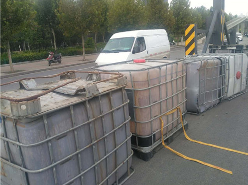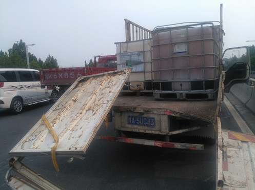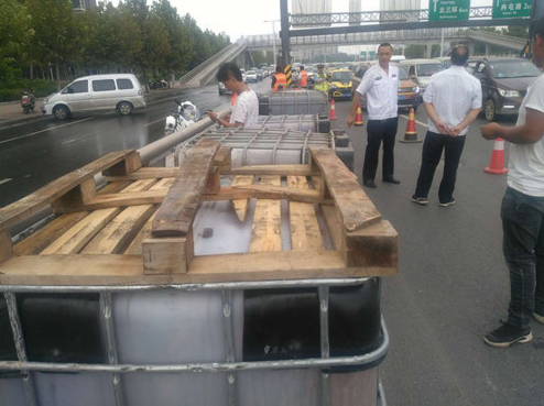 據貨車司機介紹,他車上拉的這些邊長約1米的方形大桶是裝醬油用的,當天拉著這些空桶從新鄭來到鄭州,因對路況不熟,不知道此處上橋口有3米的限高桿,直到上橋時撞上限高桿后,才知道貨車不讓上三環(huán)立交橋。