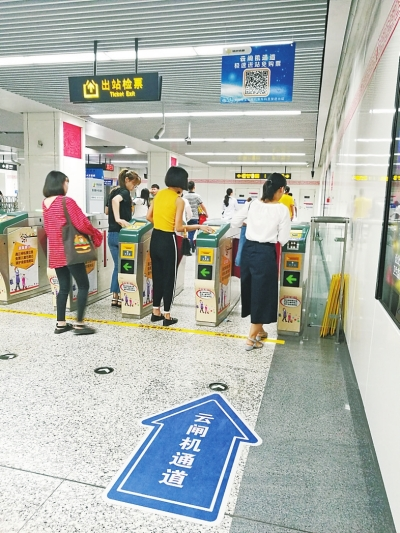 云閘機(jī)通道上方,懸掛著提示牌,上面書寫著“云閘機(jī)通道極速進(jìn)站免購票”,文字下方是二維碼,供有需要的乘客掃描。除了這兩處提示外,云閘機(jī)外側(cè),還設(shè)置了藍(lán)色箭頭,上面寫著“云閘機(jī)通道”。