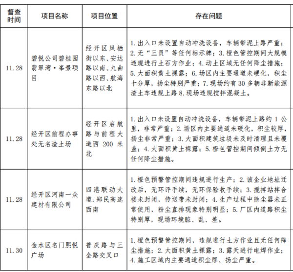 12月7日,記者從鄭州市環(huán)境污染防治攻堅(jiān)辦了解到,11 月 27 日至 12 月 3 日,鄭州市環(huán)境污染防治督導(dǎo)組重點(diǎn)對(duì)全市"封土行動(dòng)"方案、橙色預(yù)警管控措施落實(shí)和 30天沖刺行動(dòng)方案落實(shí)情況進(jìn)行督導(dǎo)檢查。