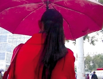 下午2時,航海路與大學(xué)路交叉口附近,一襲紅衣的張女士雨中擎?zhèn)阈凶咴谌诵械郎稀?/p>