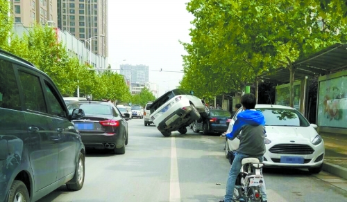 昨日上午10點(diǎn)20分,鄭州興華南街南三環(huán)公交站臺(tái)發(fā)生的一幕引起眾人圍觀(guān):一輛路虎車(chē)“騎”在奧迪車(chē)上。