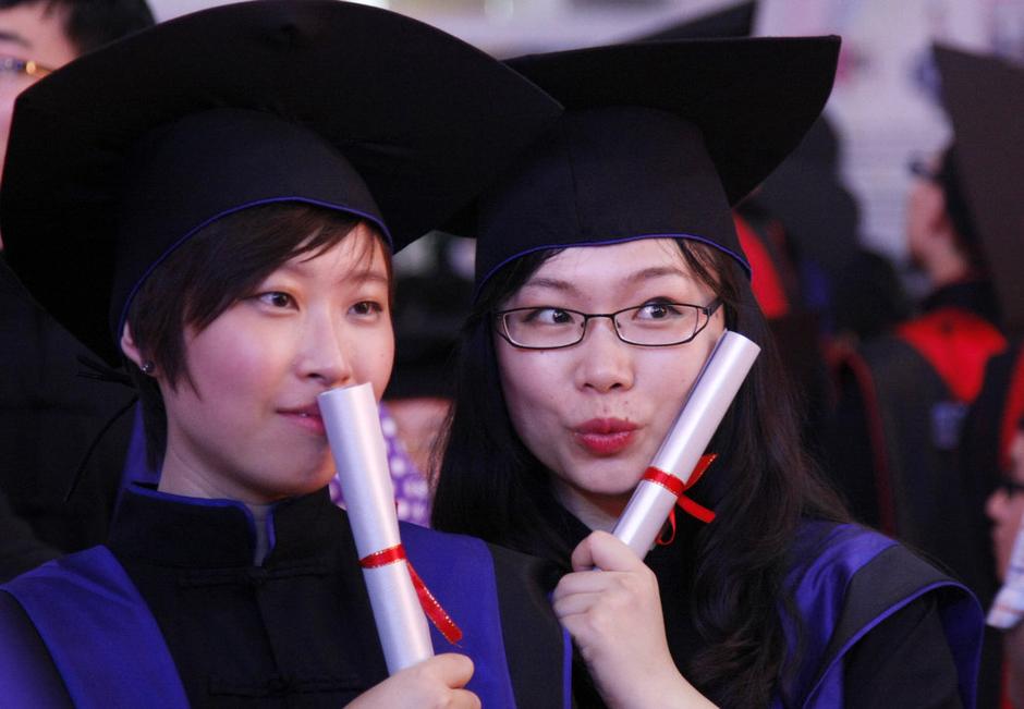 2013年6月26日晚,杭州,中國(guó)美院舉行2013屆畢業(yè)典禮,碩士畢業(yè)生統(tǒng)一身著新式學(xué)位服拍照留念。該新式學(xué)位服的學(xué)位帽不同于以往那種方方正正的,而是三角形制,每個(gè)角都有圓弧。