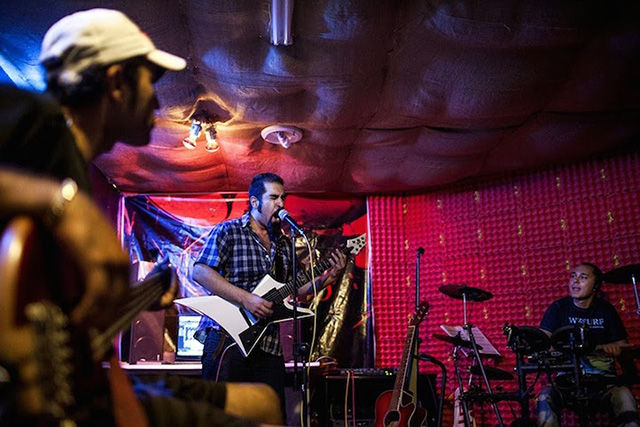 盡管照片中的人顯得很輕松,但對(duì)拍攝照片的Fatemi來(lái)說(shuō)卻十分不易。這個(gè)攝影師花了數(shù)月才被允許進(jìn)入女性健身房、發(fā)廊等。很多人不愿意被拍到臉,怕被認(rèn)出來(lái);很多人取消了預(yù)約,怕因此丟了工作。雖然存在著種種困難,F(xiàn)atemi還是取得了驚人的成果,為伊朗和外界拍攝了包羅萬(wàn)象的精美照片。圖為私人搖滾音樂(lè)會(huì)。搖滾音樂(lè)在這里是被禁止的,所以這類表演一般都很隱秘的。