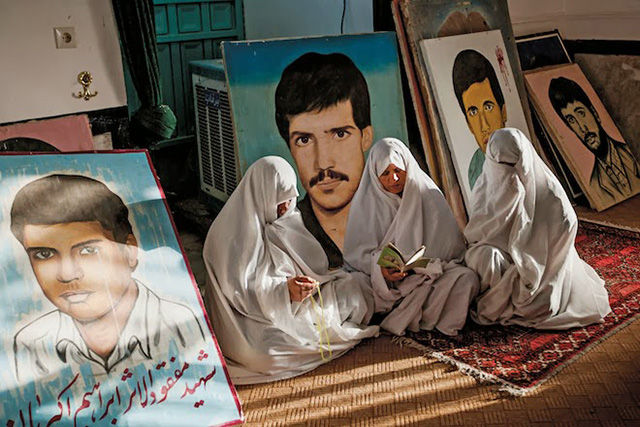 在兩伊戰(zhàn)爭(zhēng)中犧牲的烈士的母親,正在兒子墓地周圍祈禱著,周圍是他們的肖像。