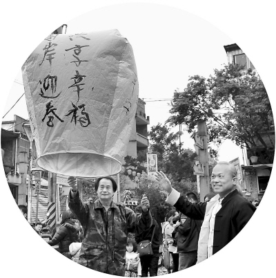 近日,臺灣毫芒雕刻家陳逢顯(右)與傳統(tǒng)天燈工藝大師林國和(左)一起放飛寫有“兩岸迎春· 共享幸?!钡奶鞜簟P卤笔衅较獏^(qū)放天燈久負(fù)盛名,已有百余年歷史。 王東明攝
