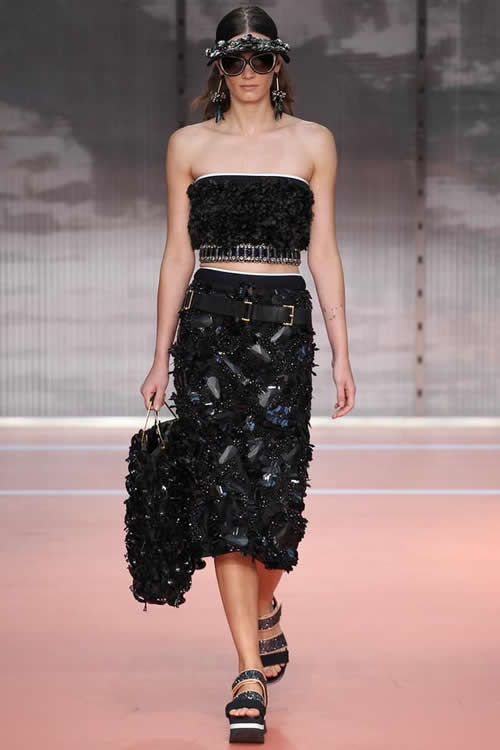 黑色立體花卉鋪滿抹胸上衣及鉛筆裙,黑色寶石渾然天成地灑落在花叢中,宛如暗夜里的點(diǎn)點(diǎn)星光,厚底拖鞋輕松地帶來(lái)一抹東方色彩。