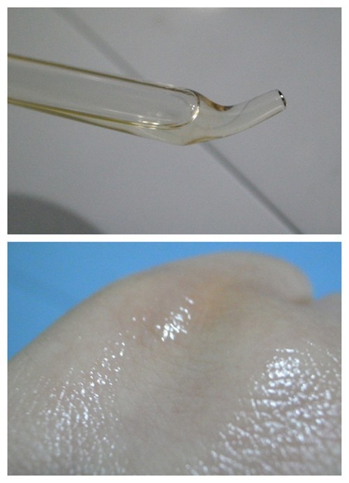 肌膚清潔之后,開始使用彼得羅夫維他命A晚間滋養(yǎng)精華液。PTR小藍瓶是水狀油質(zhì)的透明無味液體,滴在手背上極易擴散,說明它的流動性很強。稍加按摩,精華液便被完全吸收,滋潤但不黏膩,讓肌膚很有好感。