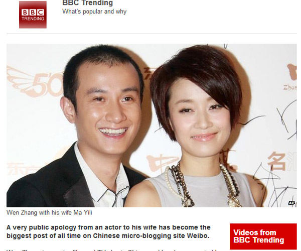 終于,出現(xiàn)在外國媒體報(bào)道中的華人明星名字不再只是鞏俐、章子怡等國際腕兒了。霸占國內(nèi)娛樂圈頭條的“文章出軌事件”,已經(jīng)漂洋過海到了全球各地,出現(xiàn)在多家國外媒體的版面上。包括英國BBC、《每日郵報(bào)》、美國《美聯(lián)社》、《紐約每日新聞報(bào)》、《好萊塢記者報(bào)道》、《娛樂在線》、澳洲《悉尼先驅(qū)晨報(bào)》、加拿大CBC、越南《民智報(bào)》新聞網(wǎng)站(dantri.com.vn)等多家外媒都對(duì)此事進(jìn)行了報(bào)道,并集體關(guān)注文章道歉微博所打破的社交媒體轉(zhuǎn)發(fā)記錄。