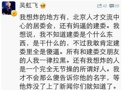 吳虹飛發(fā)表的不當(dāng)微博言論是:“我想炸的地方有北京人才交流中心的居委會(huì),還有媽逼的建委。我想說,我不知道建委是什么東西,是干什么的,不過我敢肯定建委里全是傻逼。所有和建委交朋友的人我一律拉黑。還有我想炸的人是完全無節(jié)操的所謂好人。我才不會(huì)那么傻告訴你他的名字,等他炸沒了上了新聞你們就知道了。”