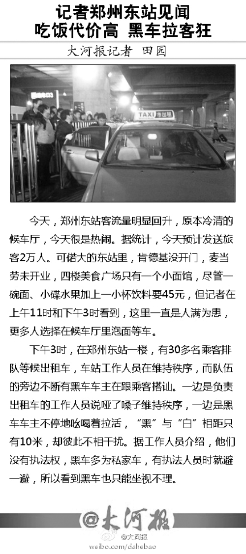 昨天,鄭州東站迎來一次客流小高峰,當天,共發(fā)送旅客將近2萬人次。記者來到鄭州東站體驗發(fā)現(xiàn),平素空曠無人的西廣場,出現(xiàn)了很多乘客的身影,三樓候車室也很熱鬧。但與熱鬧場景不相配的是,鄭州東站很多細節(jié)還未顧及到,吃飯代價高,“黑出租”與“白出租”公然搶生意。