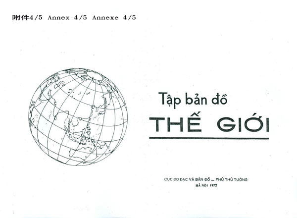 1972年5月越南總理府測(cè)量和繪圖局印制的《世界地圖集》,用中國(guó)名稱標(biāo)注西沙群島(見附件4)。1974年越南教育出版社出版的普通學(xué)校九年級(jí)《地理》教科書,在《中華人民共和國(guó)》一課(見附件5)中寫道:“從南沙、西沙各島到海南島、臺(tái)灣島、澎湖列島、舟山群島,……這些島呈弓形狀,構(gòu)成了保衛(wèi)中國(guó)大陸的一座‘長(zhǎng)城’?!?/p>