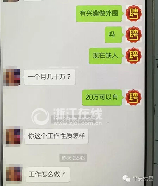 這個人自稱“安遠”,在微信里直接問趙小姐是否想做“外圍女”賺錢,還特意提到收入頗豐。她想了想,回復了三個字:有興趣。然后,兩人留了電話,約定再聯(lián)絡。