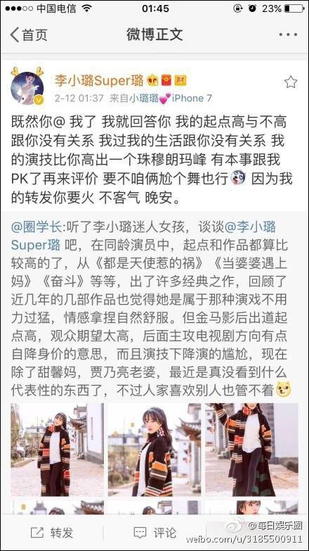 這條微博讓李小璐怒了。李小璐隨后轉(zhuǎn)發(fā)并寫道:“既然你@ 我了,我就回答你,我的起點(diǎn)高與不高跟你沒有關(guān)系,我過我的生活跟你沒有關(guān)系,我的演技比你高出一個(gè)珠穆朗瑪峰,有本事跟我PK了再來評(píng)價(jià),要不咱倆尬個(gè)舞也行,因?yàn)槲业霓D(zhuǎn)發(fā)你要火,不客氣,晚安?!?/p>
